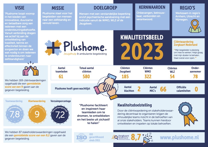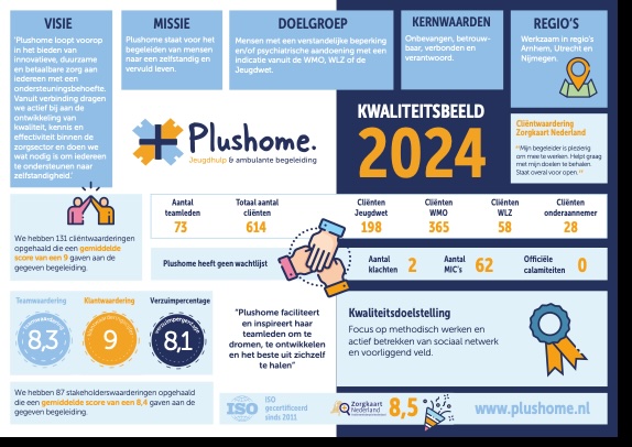 Plushome levert voornamelijk diensten binnen de Wet langdurige zorg (Wlz), de Wet maatschappelijke ondersteuning (Wmo) en de Jeugdwet. Elk jaar delen we hier kwaliteitsgegevens van onze organisatie. Dit doen we door een kwaliteitsbeeld, kwaliteitsrapport of kwaliteitsonderzoek te delen.